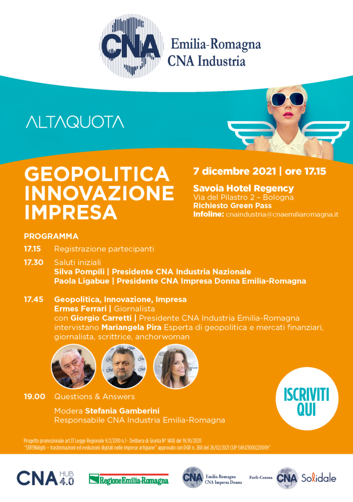 Domani, martedì 7 dicembre alle ore 17.15 a Bologna, presso il Savoia Hotel Regency si terrà l’iniziativa dal titolo “Geopolitica, Innovazione, Impresa” che vedrà la giornalista esperta di finanza ed assetti economici globali Mariangela Pira intervistata dal giornalista Ermes Ferrari e dal Presidente di CNA Industria Emilia-Romagna Giorgio Carretti.