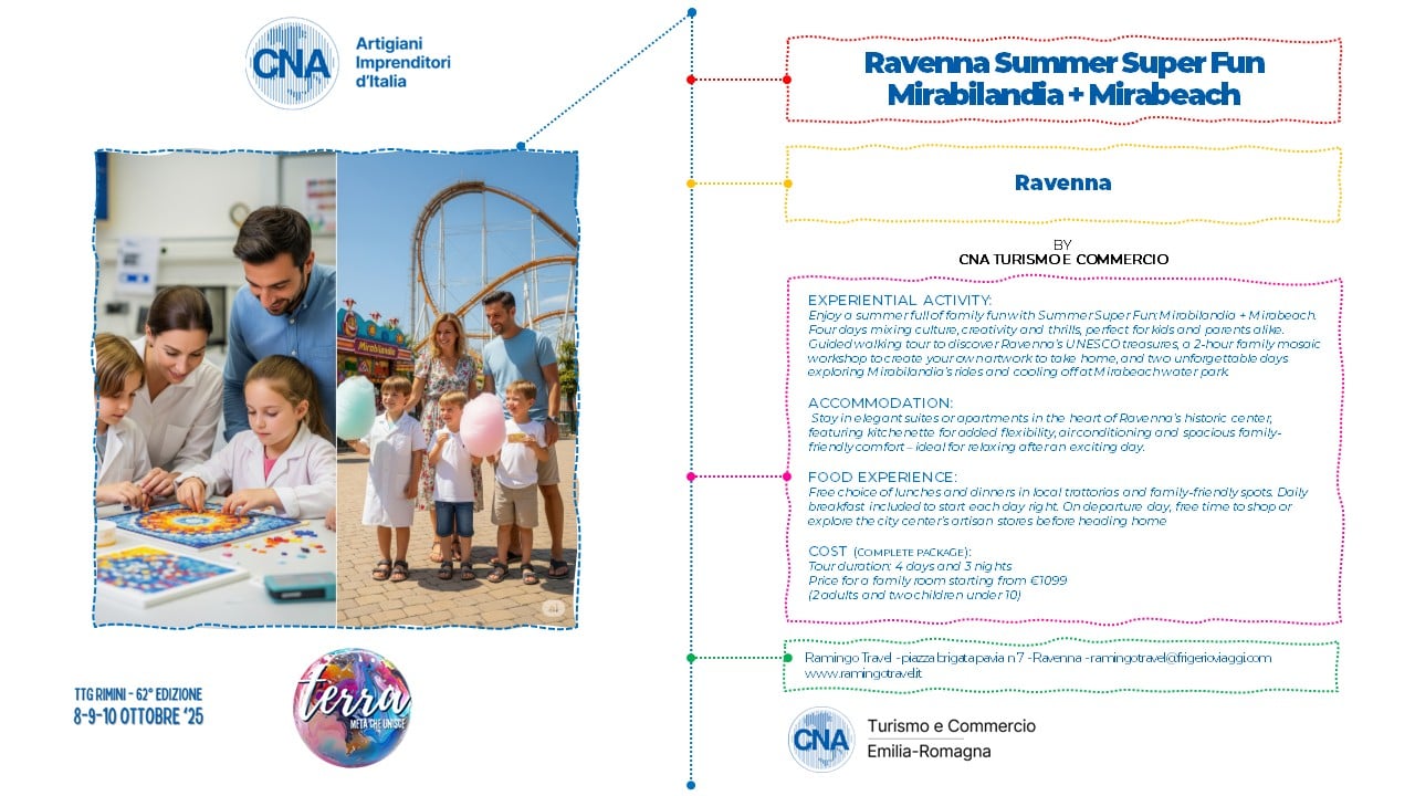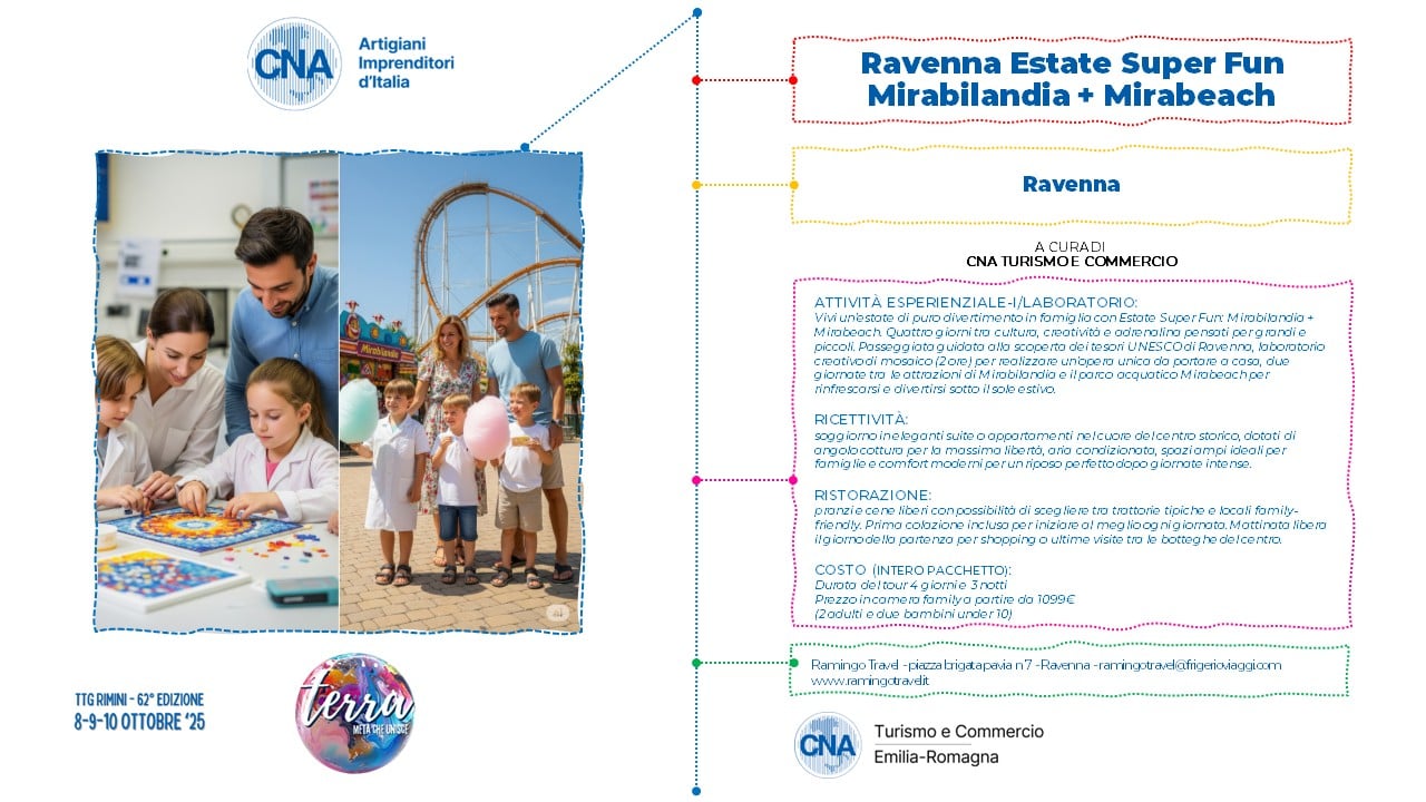 Vivi un’estate di puro divertimento in famiglia con Estate Super Fun: Mirabilandia + Mirabeach. Quattro giorni tra cultura, creatività e adrenalina pensati per grandi e piccoli. Passeggiata guidata alla scoperta dei tesori UNESCO di Ravenna, laboratorio creativo di mosaico (2 ore) per realizzare un’opera unica da portare a casa, due giornate tra le attrazioni di Mirabilandia e il parco acquatico Mirabeach per rinfrescarsi e divertirsi sotto il sole estivo.